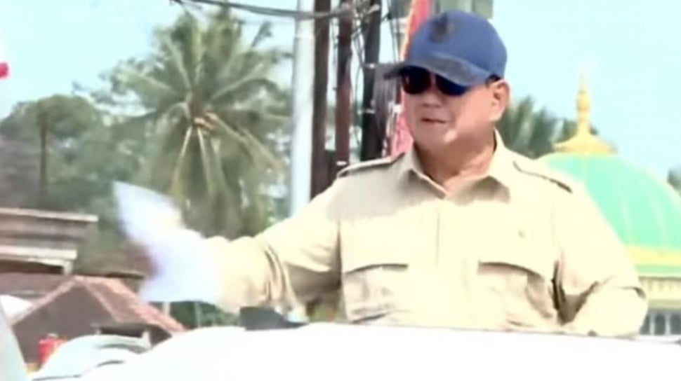 Ia mengenakan atasan safari khas berwarna krem, dilengkapi topi biru gelap dan kacamata hitam. Antusiasme warga terlihat jelas, dengan sejumlah orang berusaha mendekat dan memanggil nama Presiden saat iring-iringan kendaraan melintas.